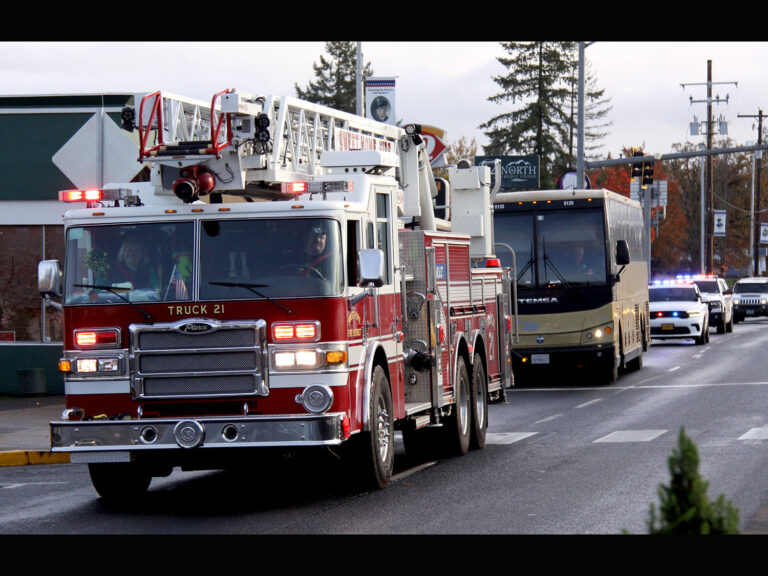 Sweet Home Fire’s ladder truck and police units escort the Sweet Home High School football team’s bus out of town Friday morning, Nov. 7, as the Huskies set off for La Grande for their first…