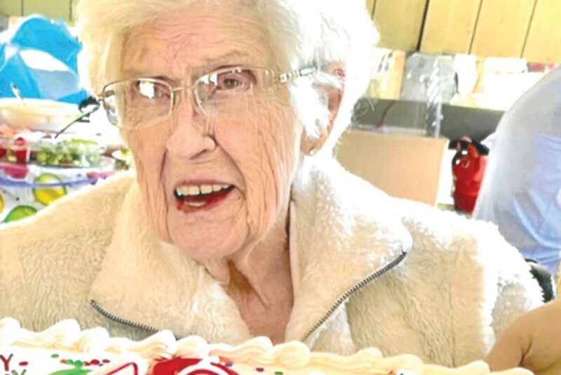Lavida “Vi” Richards, seen in the first photo and at center right in the second, celebrated her 100th birthday on Aug. 13 with her famly, pictured at top, at Waterloo Park. Sixty-five family members from Oregon, California, Washington, North Dakota, Texas and Florida were present (see third photo), including her six children, 13 grandchildren, 23 great-grandchildren and one great-great-grandchild. Born Aug. 15, 1922 in Iowa, she moved to Sweet Home in 1941, becoming very active in the community, and at 90 received a VIP Award, above, at the 2012 Chamber of Commerce awards banquet