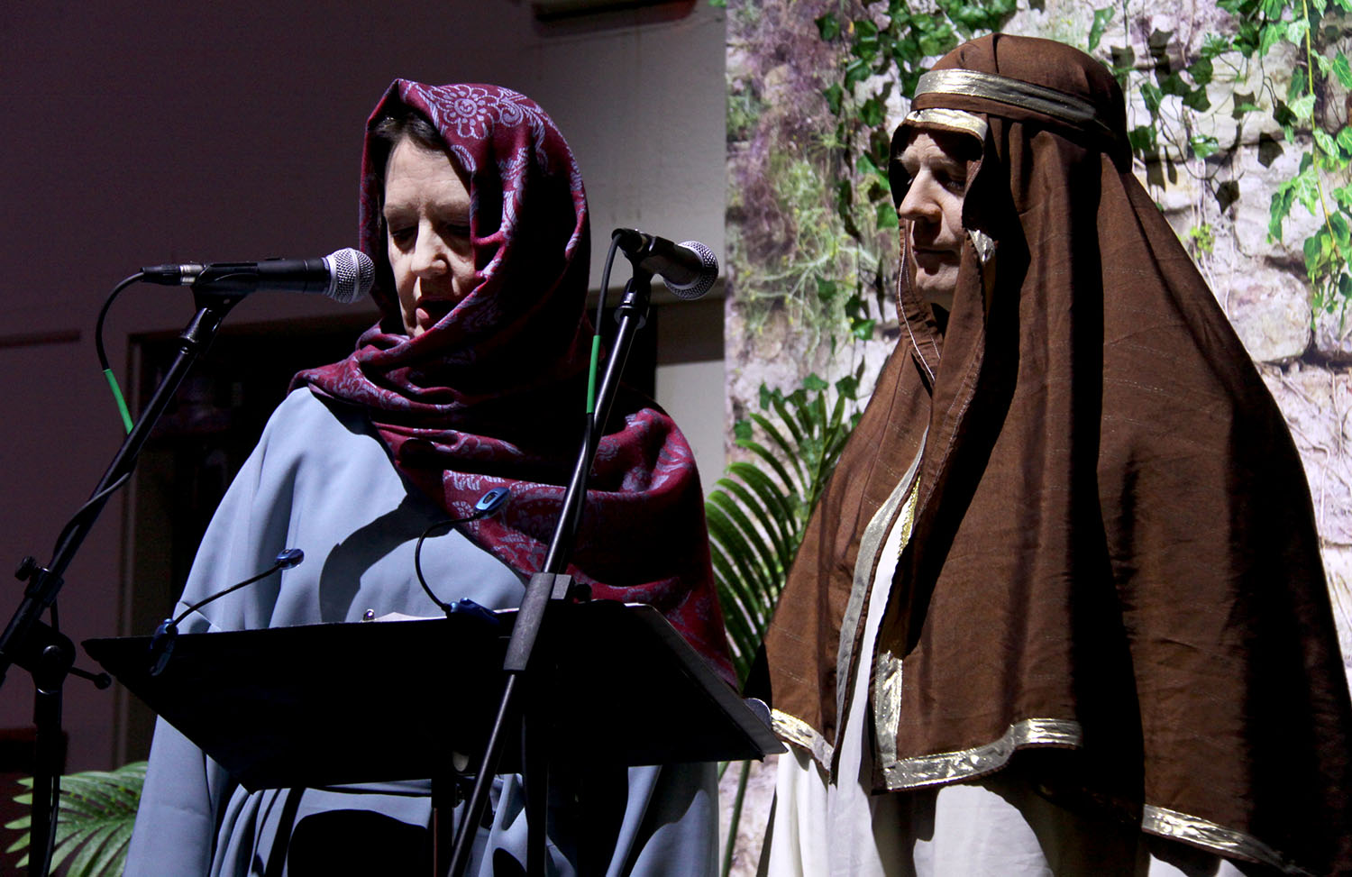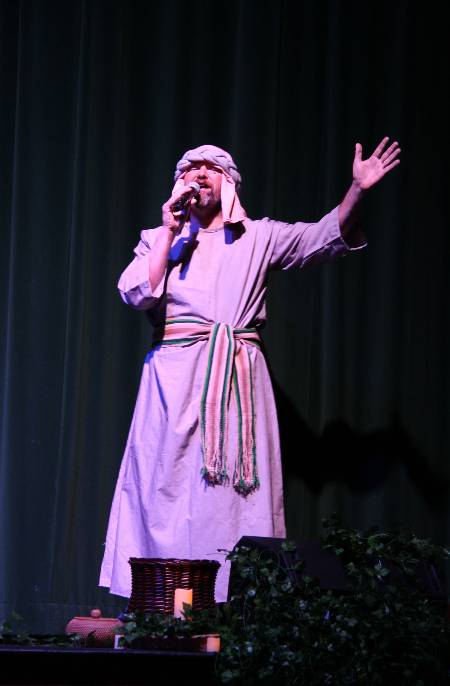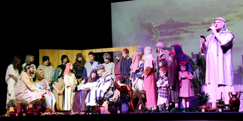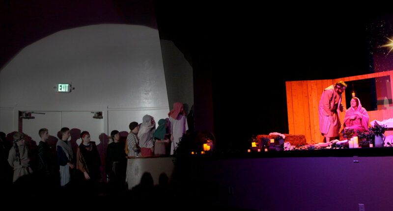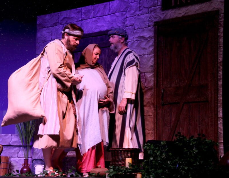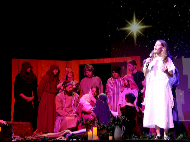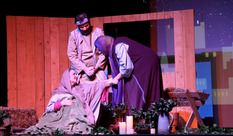 Above, Ember Ogden, right, sings “Born is the Light of the World,” one of the musical numbers during “The Innkeepers” play, which was staged last weekend at Sweet Home Auditorium by SHOCASE. Behind her, shepherds gather around Mary and Joseph and the baby Jesus., which was theme of the play.