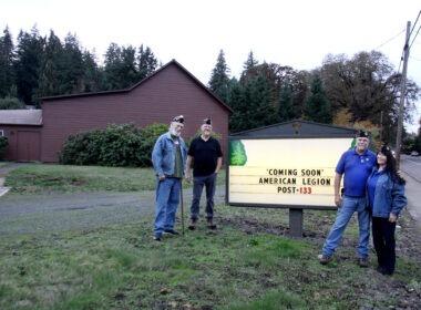 Kat Cox stands with other officers of Sweet Home’s American Legion Post 133 in the spacious basement of…