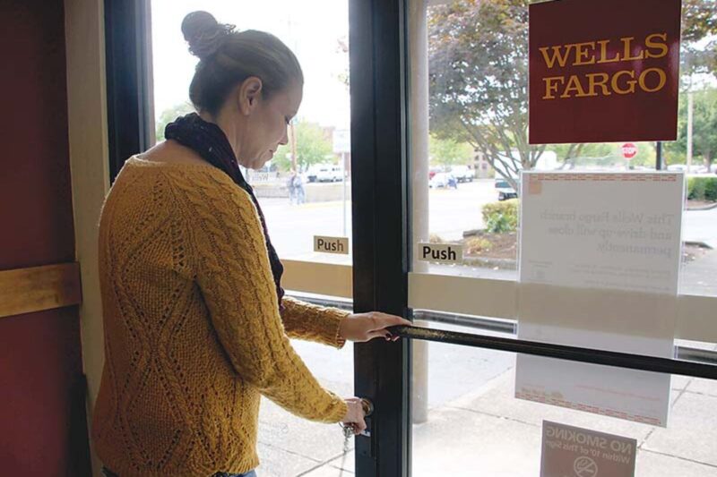 Nichole Forbes, manager of Wells Fargo branch in Sweet Home locks the door for the final time after the bank closed at noon Wednesday, Sept. 12. Customers received letters in June informing them of the closure, which a bank official blamed on “a decrease in customer traffic over the last few years.”