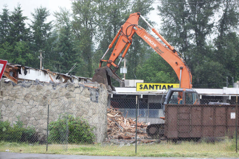 A shovel tears down a portion of what used to be the video store in Santiam Plaza, which will soon be the site of a new Taco Bell, on the northeast corner of 15th and Main. Demolition began Friday. Meili Construction, a Eugene-based general contractor that specializes in commercial development, is handling the project.