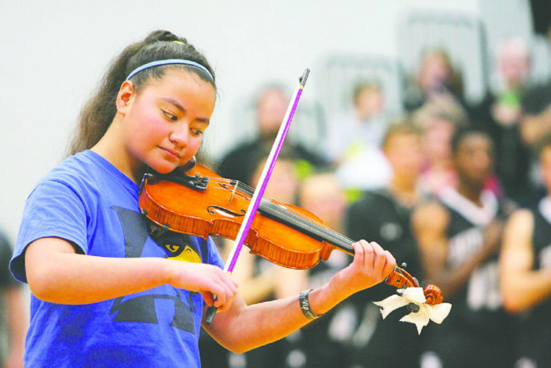 Holley fifth-grader Moriah Winn performs the “Star Spangled Banner” before the Sweet Home High School boys basketball game Friday night, February 3, in the Main Gym.