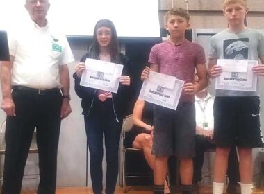 Three Hawthorne students hold their awards after winning the 2019 Sweet Home Elks’ Americanism Essay Contest, presented during…