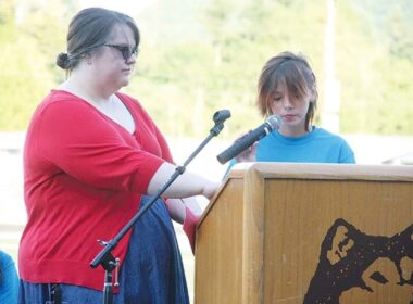 Sweet Home Junior High Principal Colleen Henry stands by as Melody Windom gives a speech to her classmates…