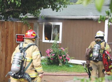Flames are visible in a window, above as firefighters approach a house at 1190 27th Ave. Friday morning,…