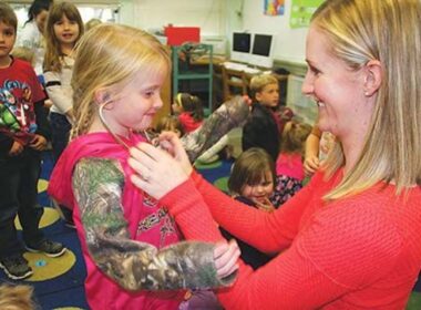 College of Osteopathic Medicine of the Northwest medical student Heather Wheeler helps Foster School kindergartener Aleigha Smith try…