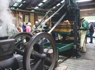 Joe Brocard III, right, in apron, manages his 1913 hydraulic apple cider mill Saturday, Oct. 21, during his…