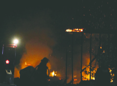 Firefighters battle a blaze on the old Weyerhaeuser mill property, now owned by Linn County at the north…