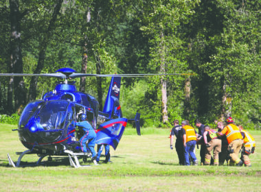 Sweet Home Fire and Ambulance District personnel carry an injured motorcyclist to a waiting LifeFlight helicopter at Sunnyside…