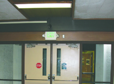 Several ethernet cables run haphazardly across the roof of the Sweet Home Junior High, one of them meandering…