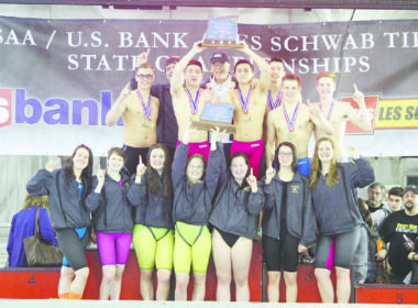 Sweet Home’s boys and girls celebrate their double state swimming championship Saturday night at Mt. Hood Community College.…