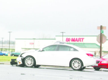 A DAMAGED CAR rests in the westbound lanes of Main Street following a two-vehicle crash at the intersection…