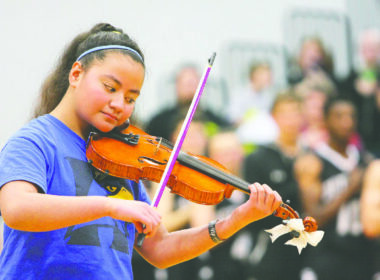 Holley fifth-grader Moriah Winn performs the “Star Spangled Banner” before the Sweet Home High School boys basketball game…