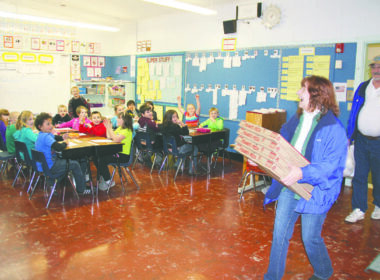 Surprised and delighted students shout, “Pizza!” and cheer as Sweet Home Elks Leading Knight Charly Bashaw, above, carries…