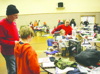 Red-shirted volunteers Richard Ingham, left, and Chris Layne help Doug Baxter, 10, foreground, and James Gardner, 6, shop.…