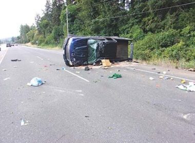 An overturned pickup blocks the eastbound lanes of Highway 20 near milepost 23, about five miles west of…