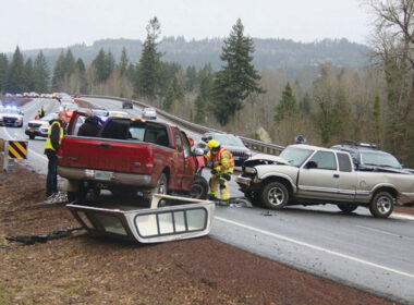 Sweet Home Fire and Ambulance District personnel work in the Narrows where these trucks collided near Milepost 25…