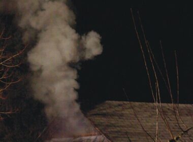 In the first photo, smoke arises from the attic of a home at 255 21st Ave. that was…