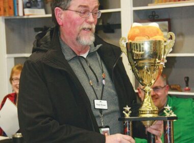 In the first photo, Sweet Home High School Principal Ralph Brown, left, hoists the district’s attendance trophy, which…