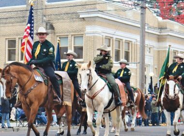 Larry Chafin of Sweet Home, left, leads the Linn County Sheriff’s Mounted Posse during the Veterans Day Parade…