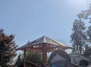 A new roof hangs over the loggers statues in front of the East Linn Museum at the intersection…