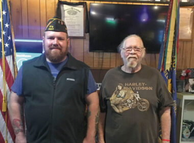 Kurtis Begley, left, was sworn in as the new Sweet Home VFW commander and Dennis Lindsay, right, was…
