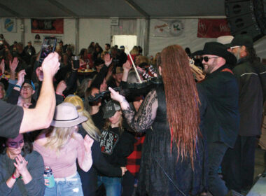 Country music fans get their groove on with a crowd appearance by headliner Kurt Van Meter, second from…