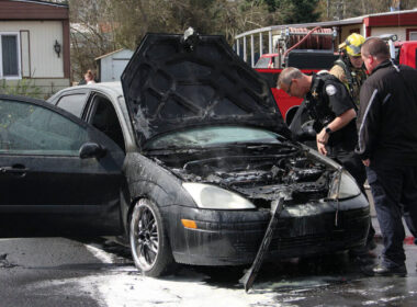 Police and fire personnel inspect a black 2003 Ford Focus that burned at 1530 Tamarack St. on Tuesday,…