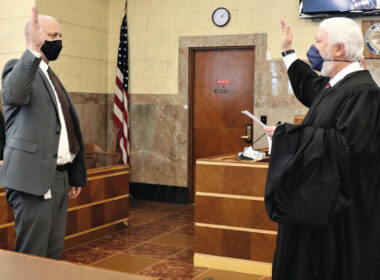 Linn County Circuit Court Presiding Judge Thomas McHill, right, administers the oath of office to new Judge Keith…