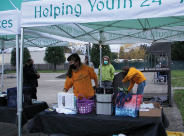 Kate Hemlock, an intern at Jackson Street Youth Services, sets up a table with hot meals, hot chocolate,…