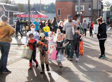 In the first photo, trick-or-treaters head east on Main Street after filling up with candy from Sunshine Espresso…