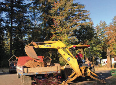 Cascadia resident Roy Stokes, right, in main photo, breaks ground for new mailboxes that will be installed at…