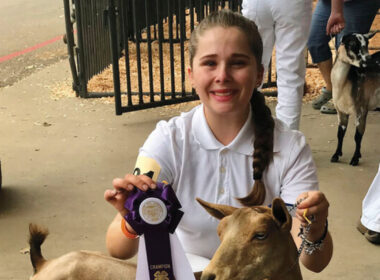 In the first photo, Pippi Somatis shows off the grand champion ribbon she won with her dairy goats,…