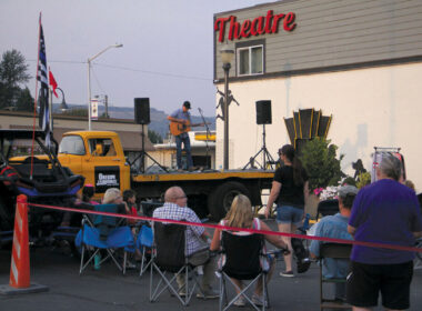 Adam Larson performs in the parking lot next to the Rio Theatre Tuesday evening, Aug. 24, to a…
