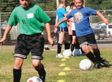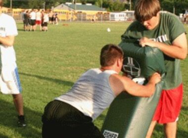 Cody Felkins, right, and Caleb Keeney work on blocking skills during last week’s football camp. The annual football…