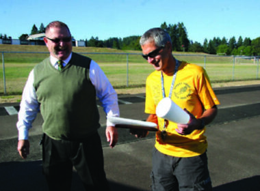 Sweet Home High School Athletic Director Steve Brown, left, showed up unexpectedly at a cross-country practice last week…