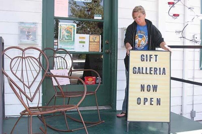 On the front porch is a makeshift signboard proclaiming “Gift Galleria now open!” beneath elegant candleholders made by John May, a local metal artist.
