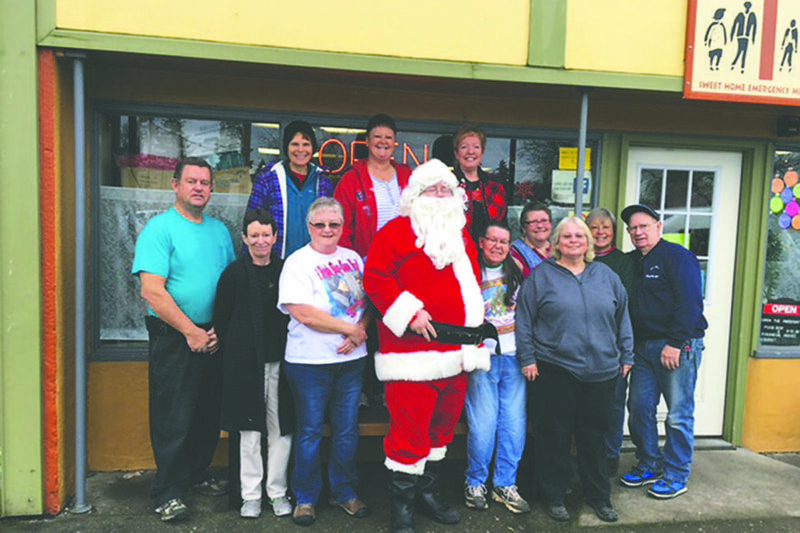 Santa Claus (also known as Safeway Service Operations Manager Brian Adams) and volunteers, above, team up at Sweet Home Emergency Ministries Dec. 22 to hand out Santa Buck Meals to local residents in need. Funding came from Safeway shoppers who purchased Santa Bucks in recent weeks, right.