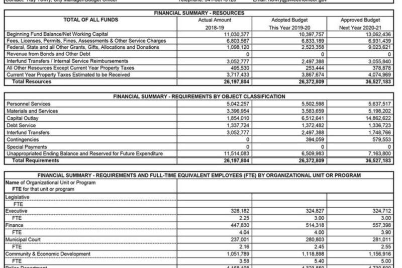 A copy of the budget may be inspected or obtained at City Hall between the hours of 7 a.m. and 5 p.m. or online at sweethomeor.gov. This budget is for an annual budget period. The budget was prepared on a basis of accounting that is the same as the preceding year.