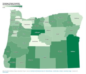 In Oregon, the average Supplemental Nutritional Assistance Program, or SNAP, benefit for a single person is $6 a day. SNAP benefits to Oregon are about $140 million a month, according to U.S. Department of Agriculture data.