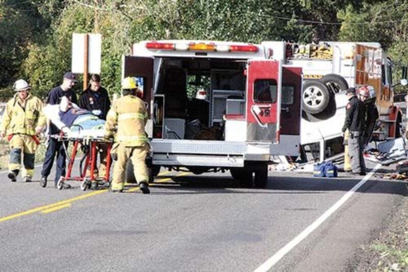 Sweet Home Fire and Ambulance District rescue workers assist a Brownsville woman whose vehicle, right, rolled over Friday morning, Sept. 25, on Highway 228 near McKercher Park.