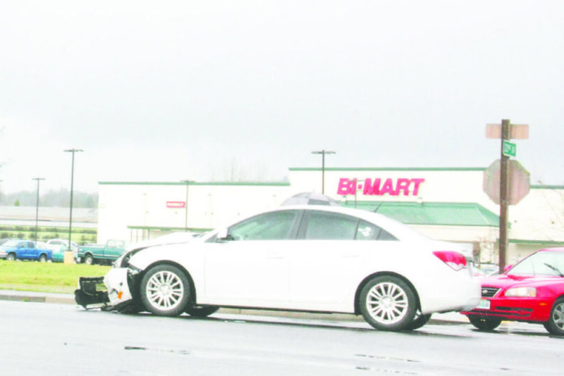 A DAMAGED CAR rests in the westbound lanes of Main Street following a two-vehicle crash at the intersection of 22nd and Main on Thursday, Feb. 16. Jeremy Lee Sanders, 34, was cited for failure to obey a traffic control device following the crash. The second driver was Gary Laverne Burns, 66. Neither were injured.The crash blocked the westbound lanes. Police and firefighters responded to the crash at 1:36 p.m.