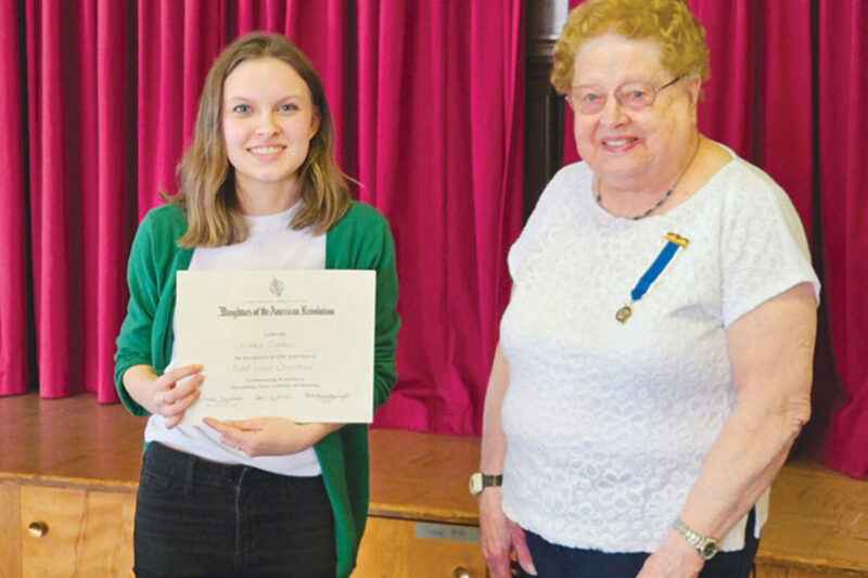 Luka Ogden, of Sweet Home, left, a student at East Linn Christian Academy, holds a first-place Good Citizen Award during a tea hosted April 13 by the Santiam Chapter of the Oregon Daughters of the American Revolution Tea at the United Methodist Church in Lebanon. With her is Good Citizen co-chair Marilyn York. (Two other honorees had schedule conflicts and could not be present.)