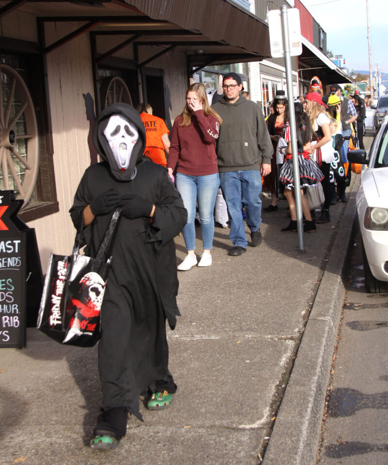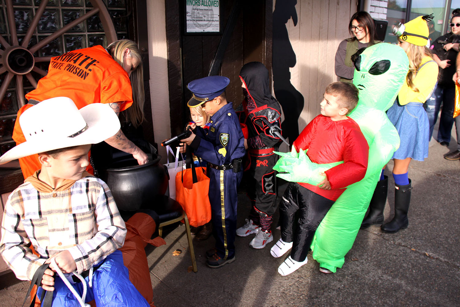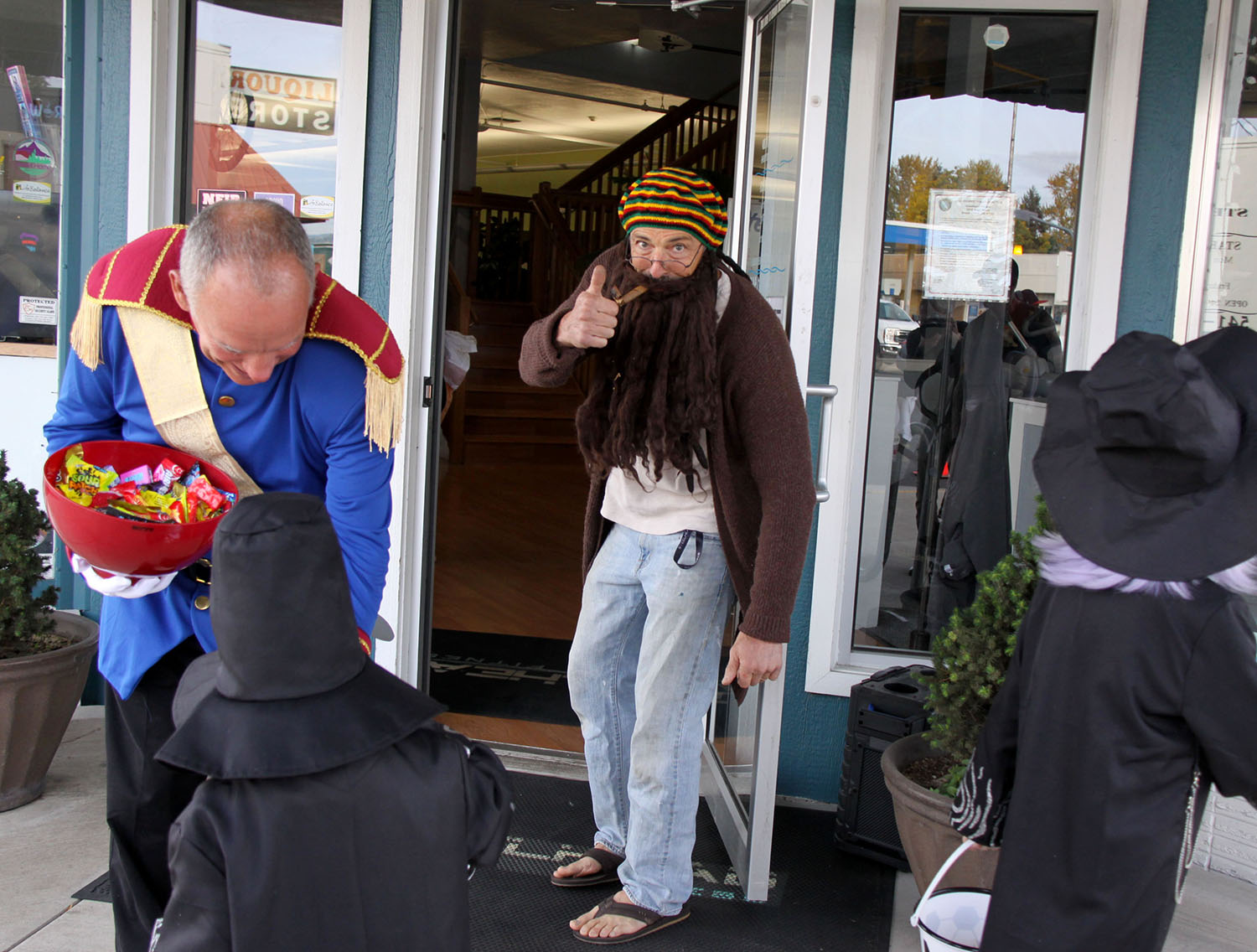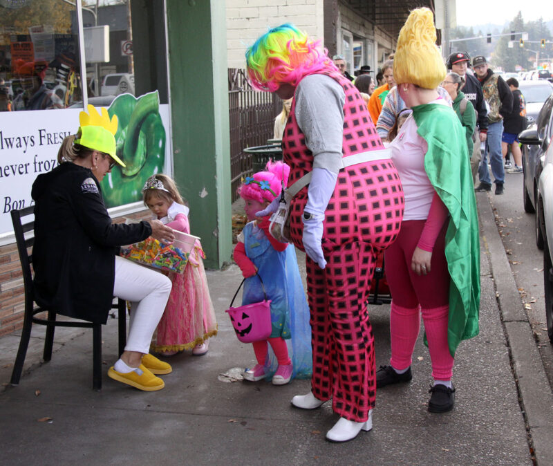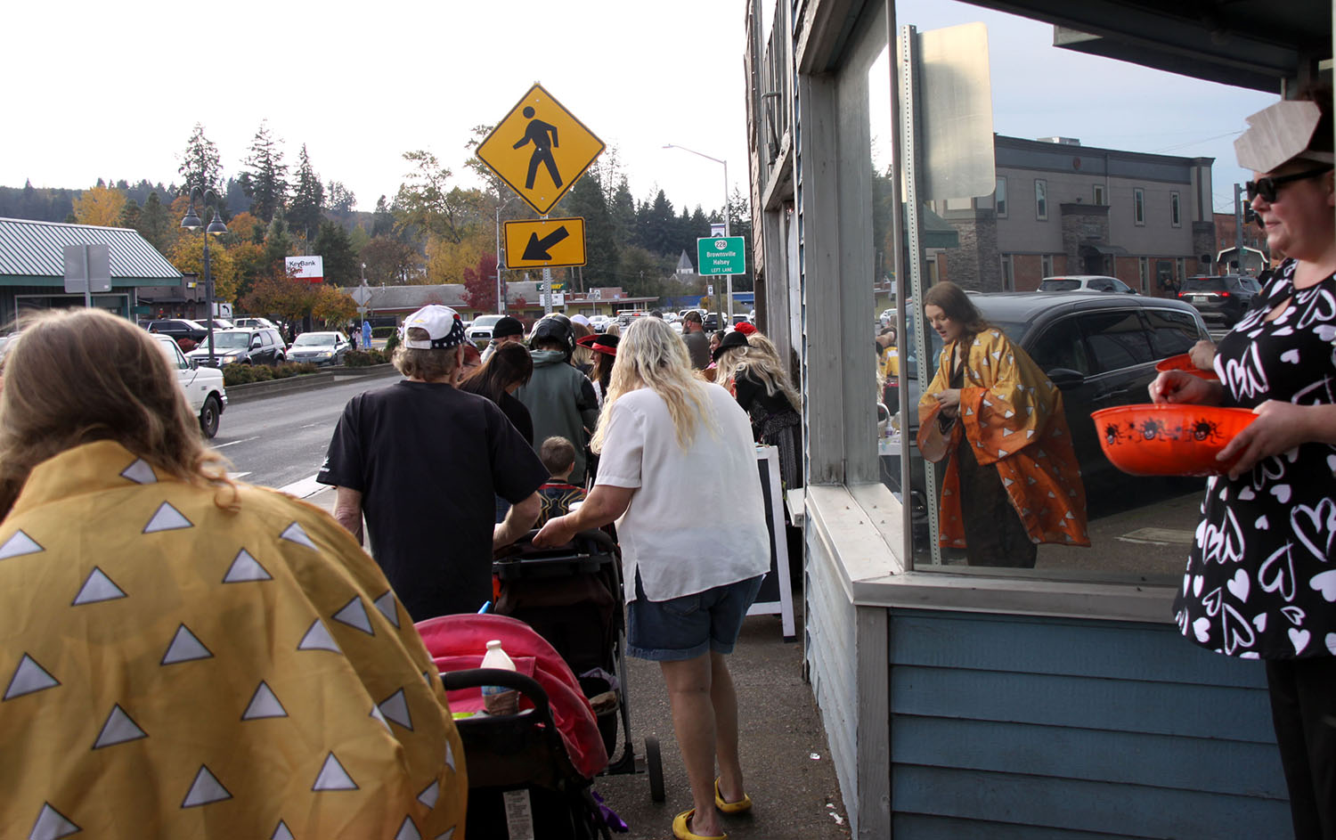 Paula Newman, left, owner of Figaro’s Pizza, hands out candy as a long line of trick or treaters await the goodies on Main Street. Photos by Scott Swanson