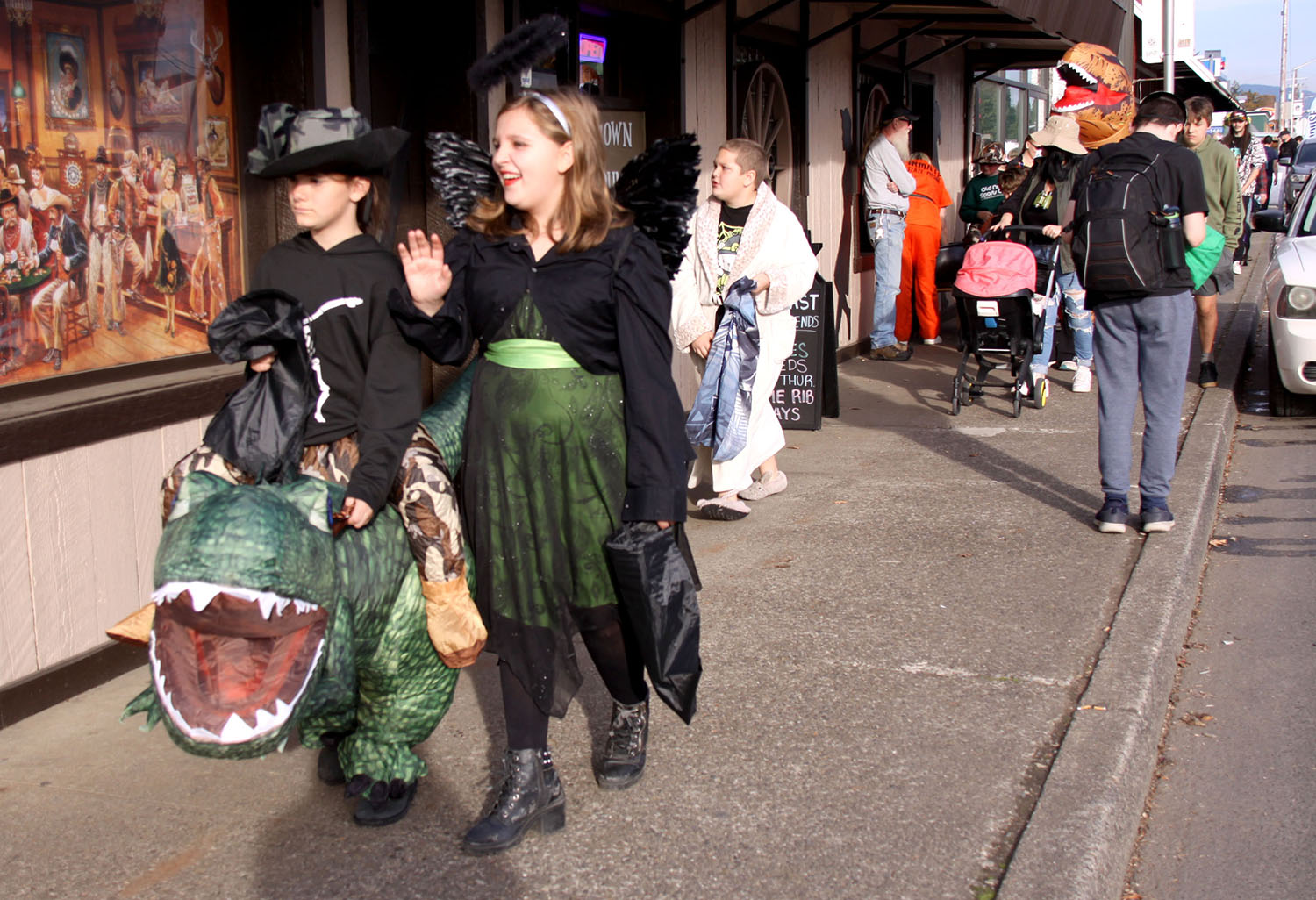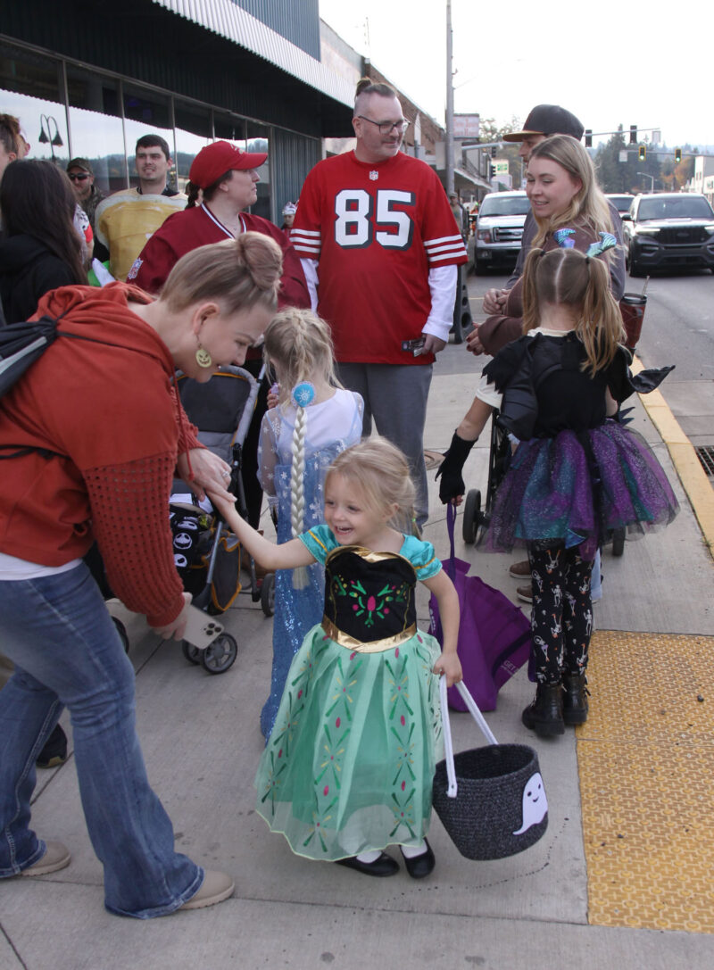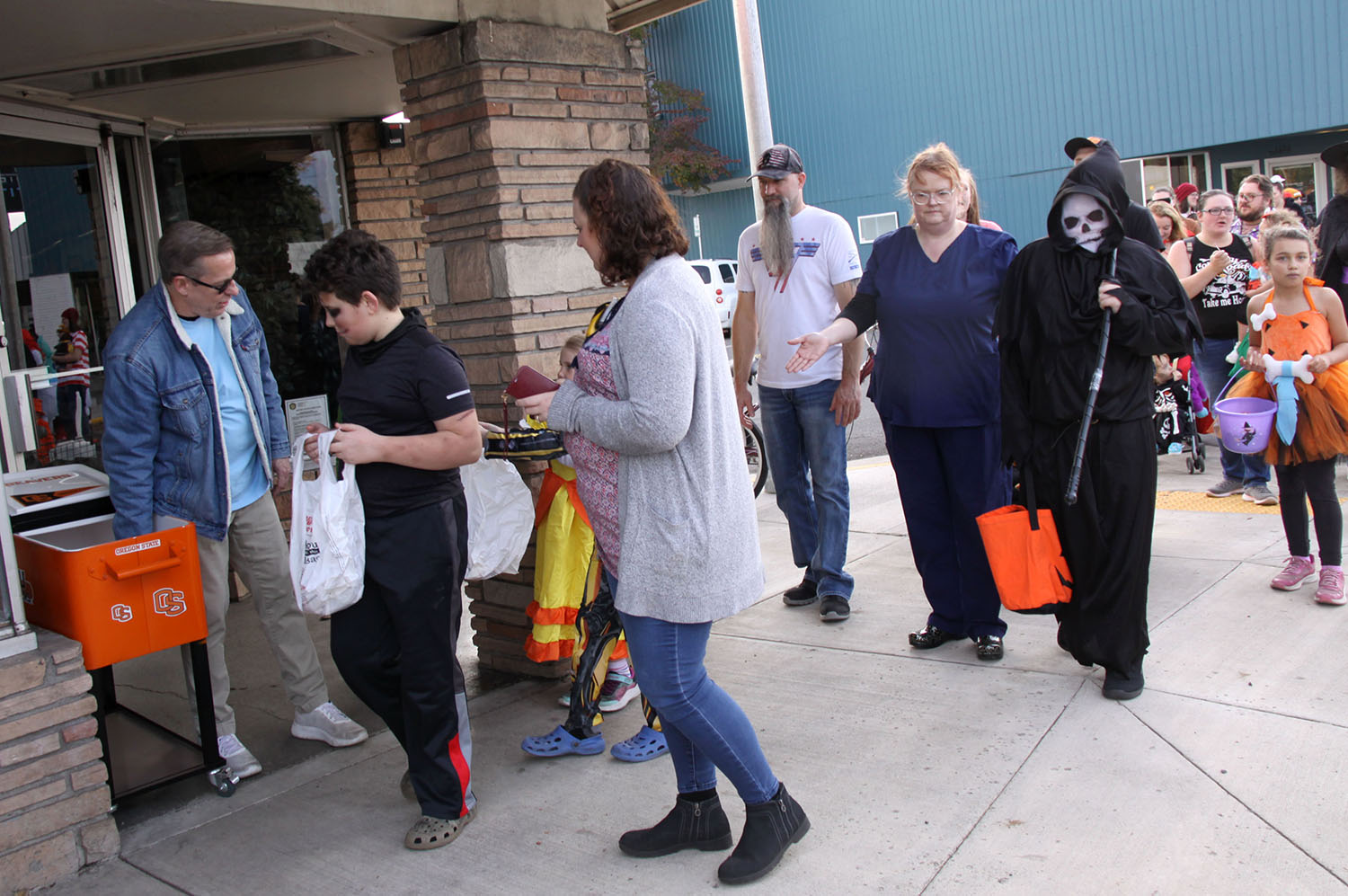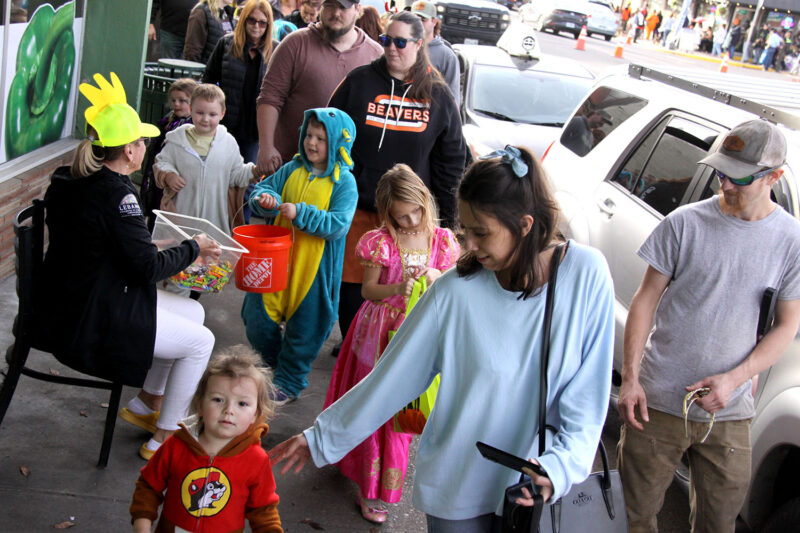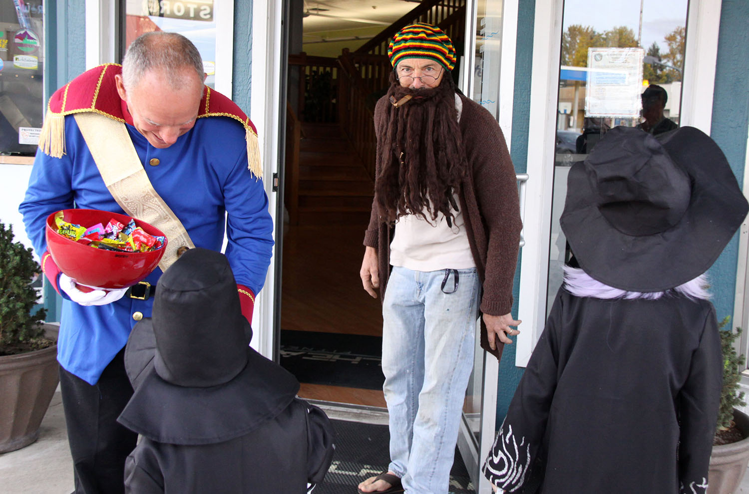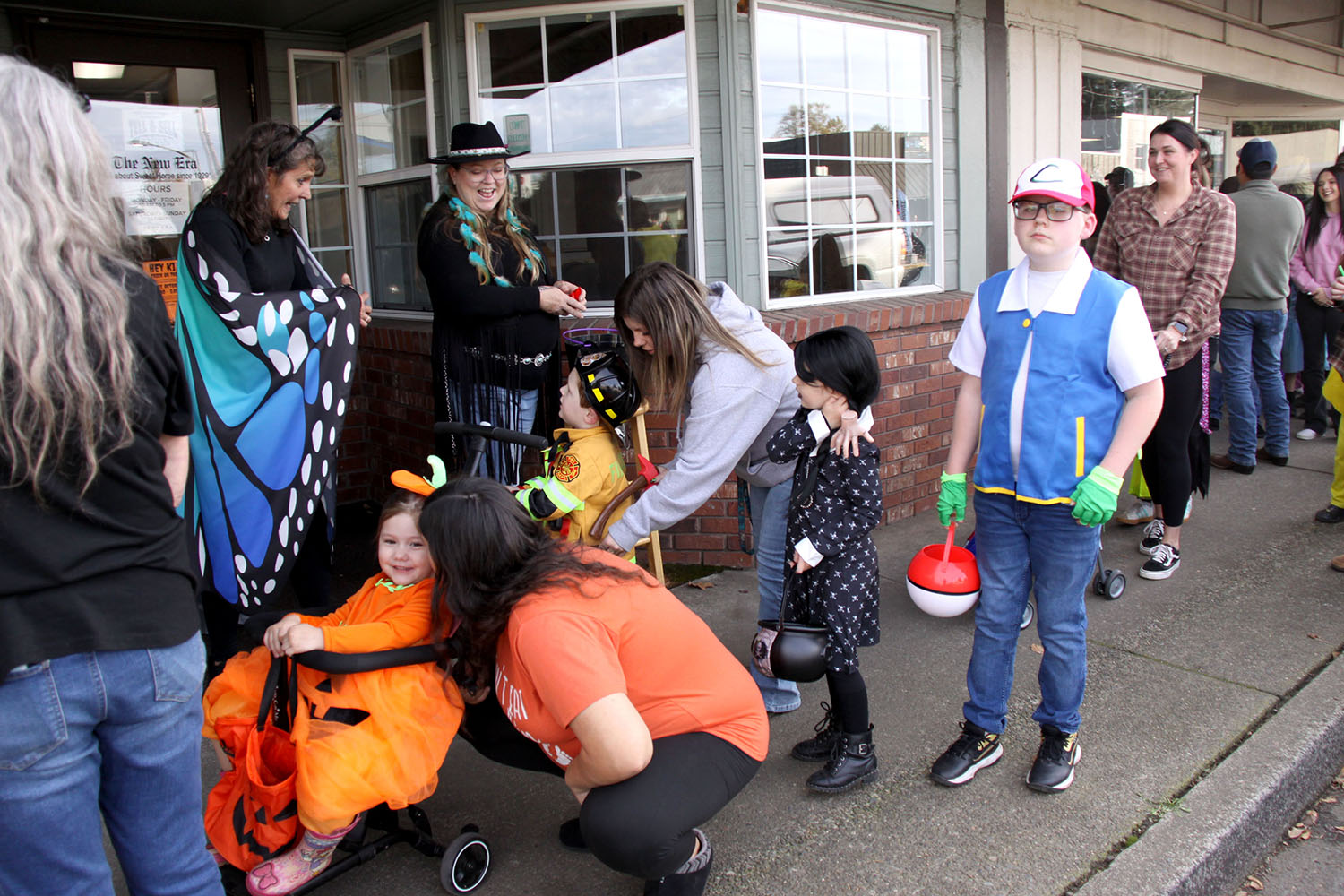 Paula Newman, left, owner of Figaro’s Pizza, hands out candy as a long line of trick or treaters await the goodies on Main Street. Photos by Scott Swanson