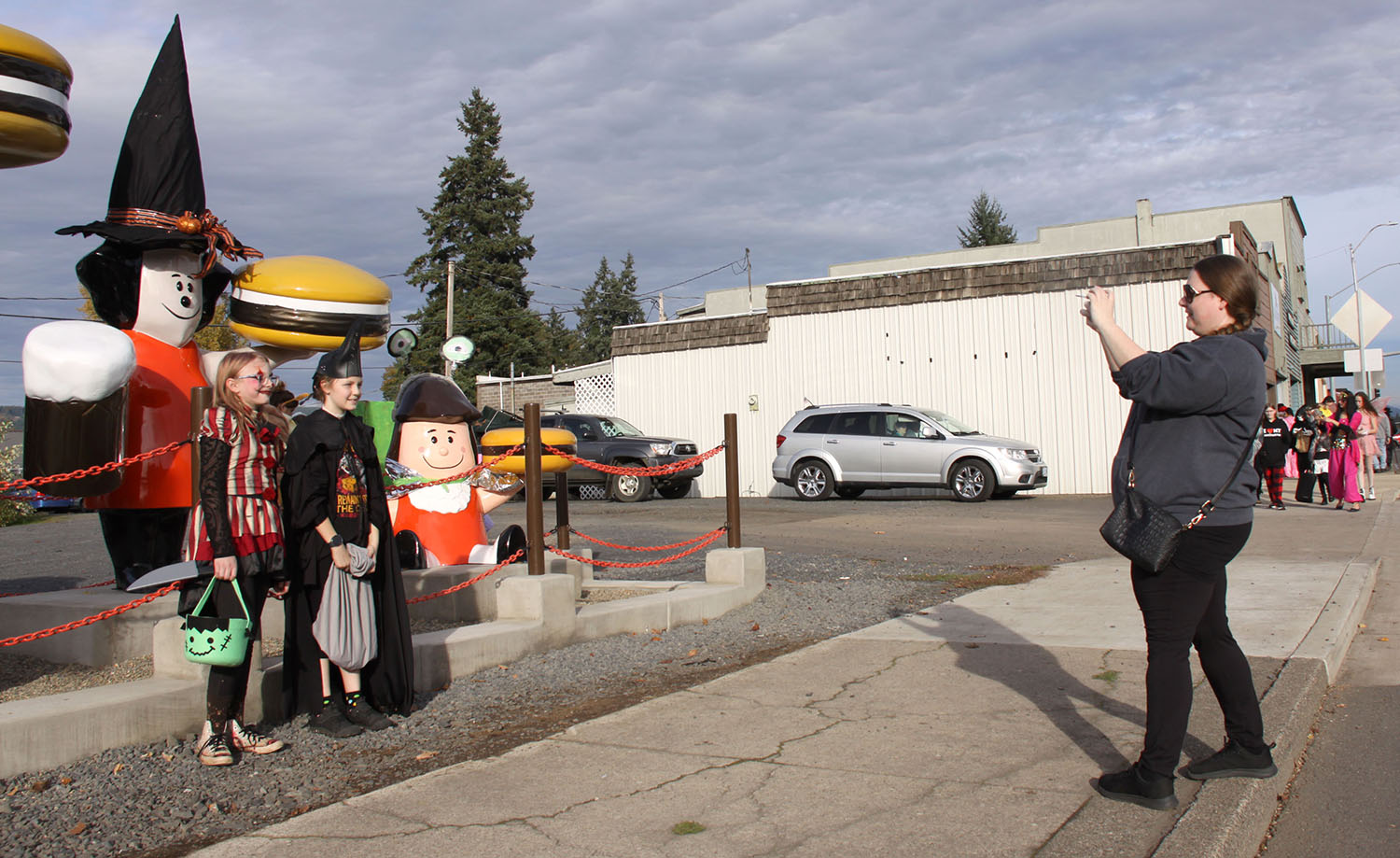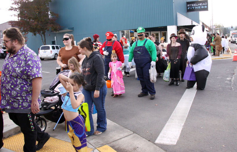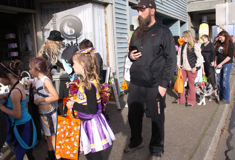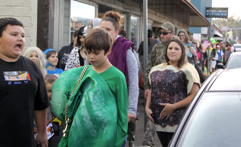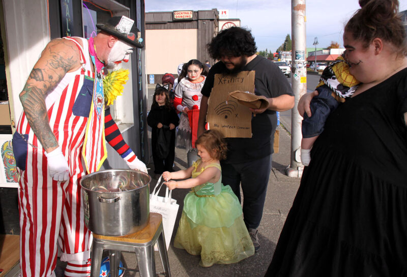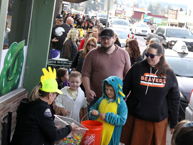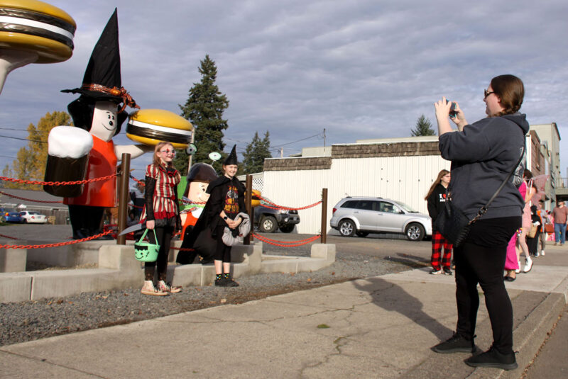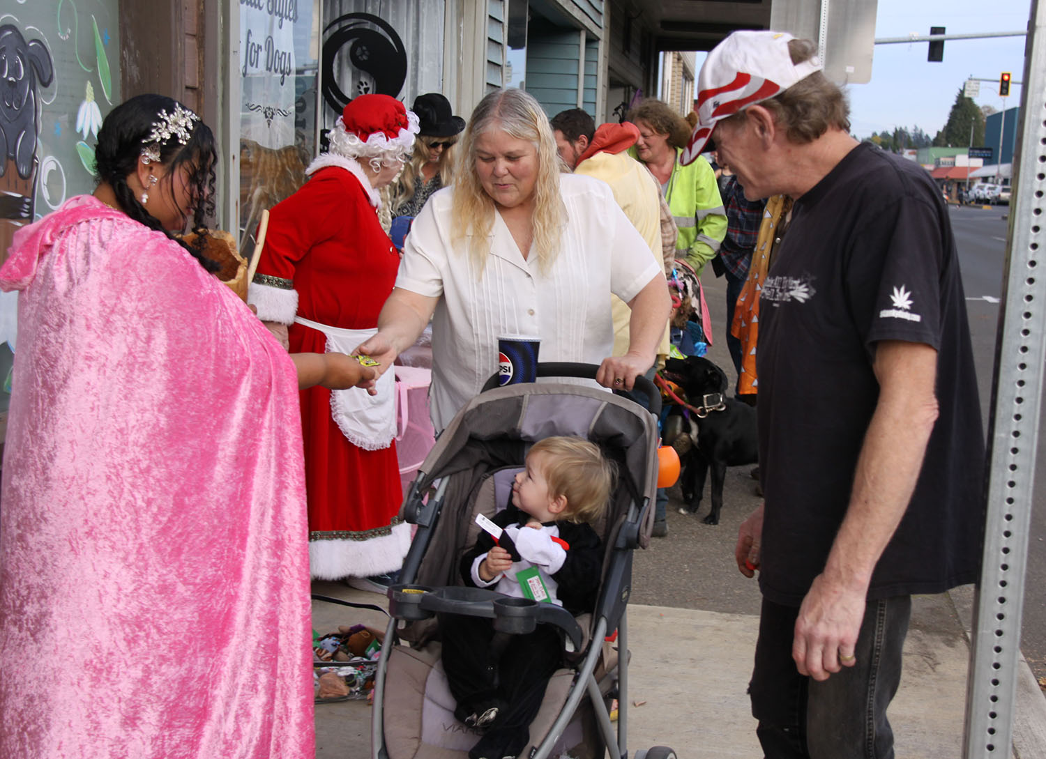 Paula Newman, left, owner of Figaro’s Pizza, hands out candy as a long line of trick or treaters await the goodies on Main Street. Photos by Scott Swanson