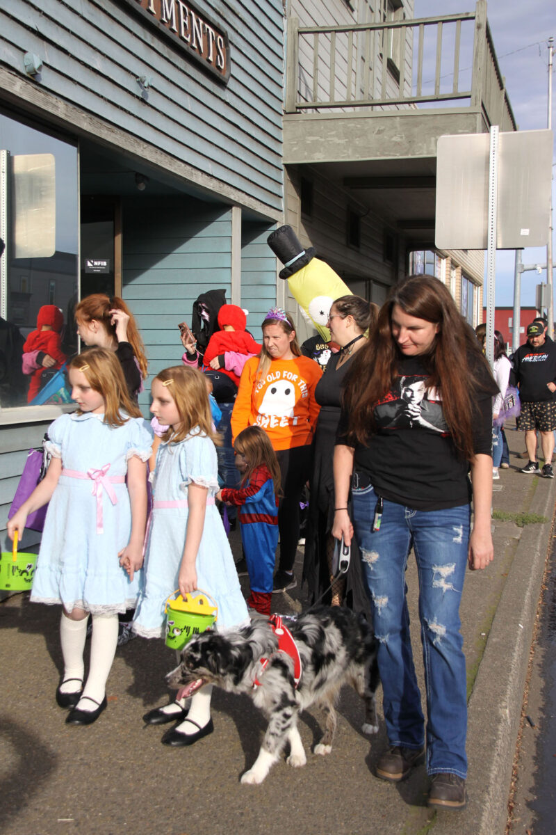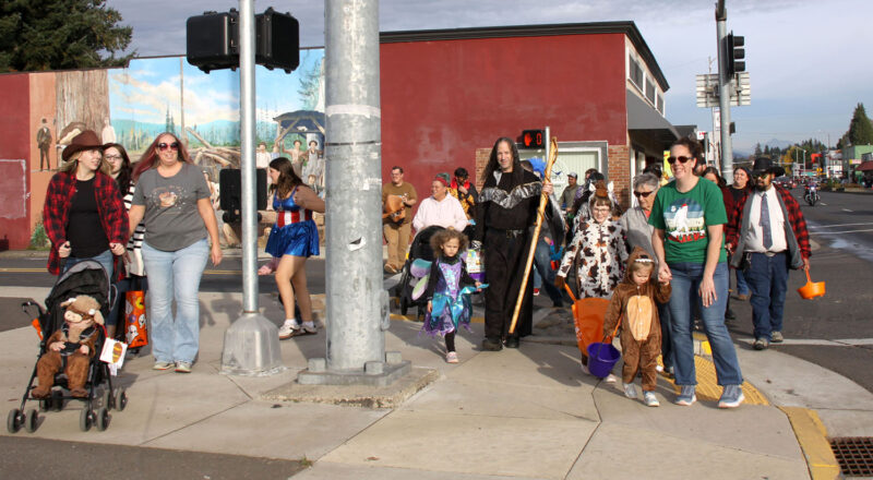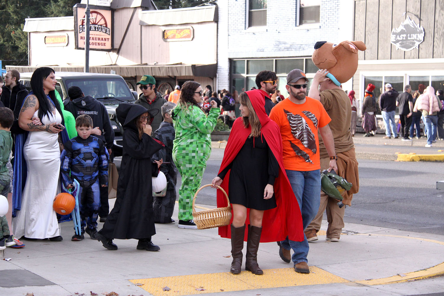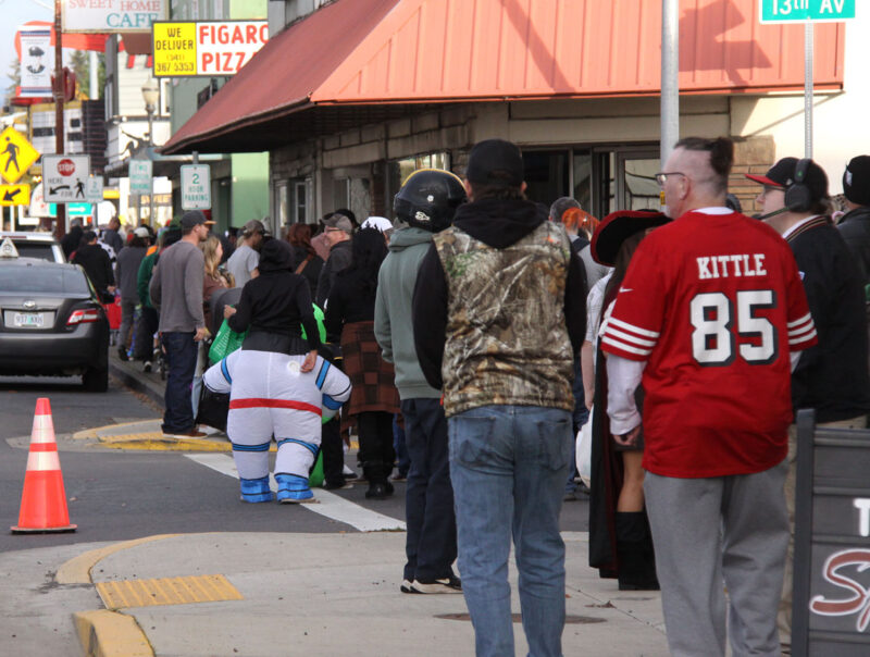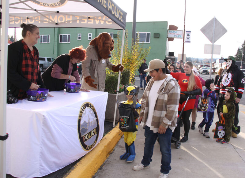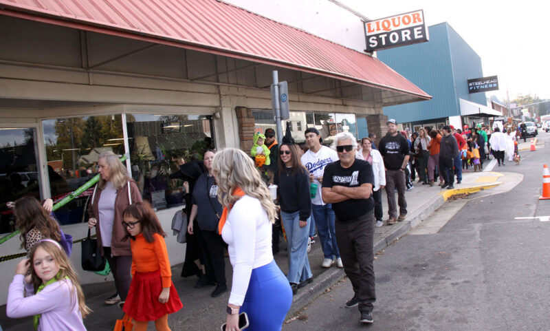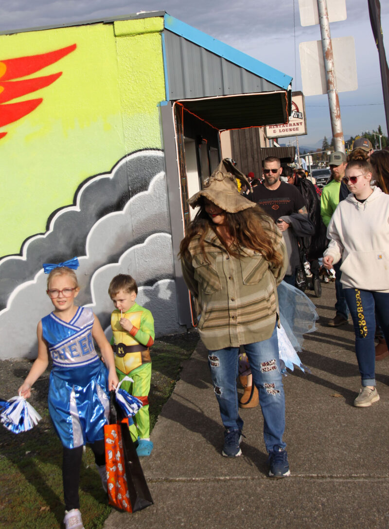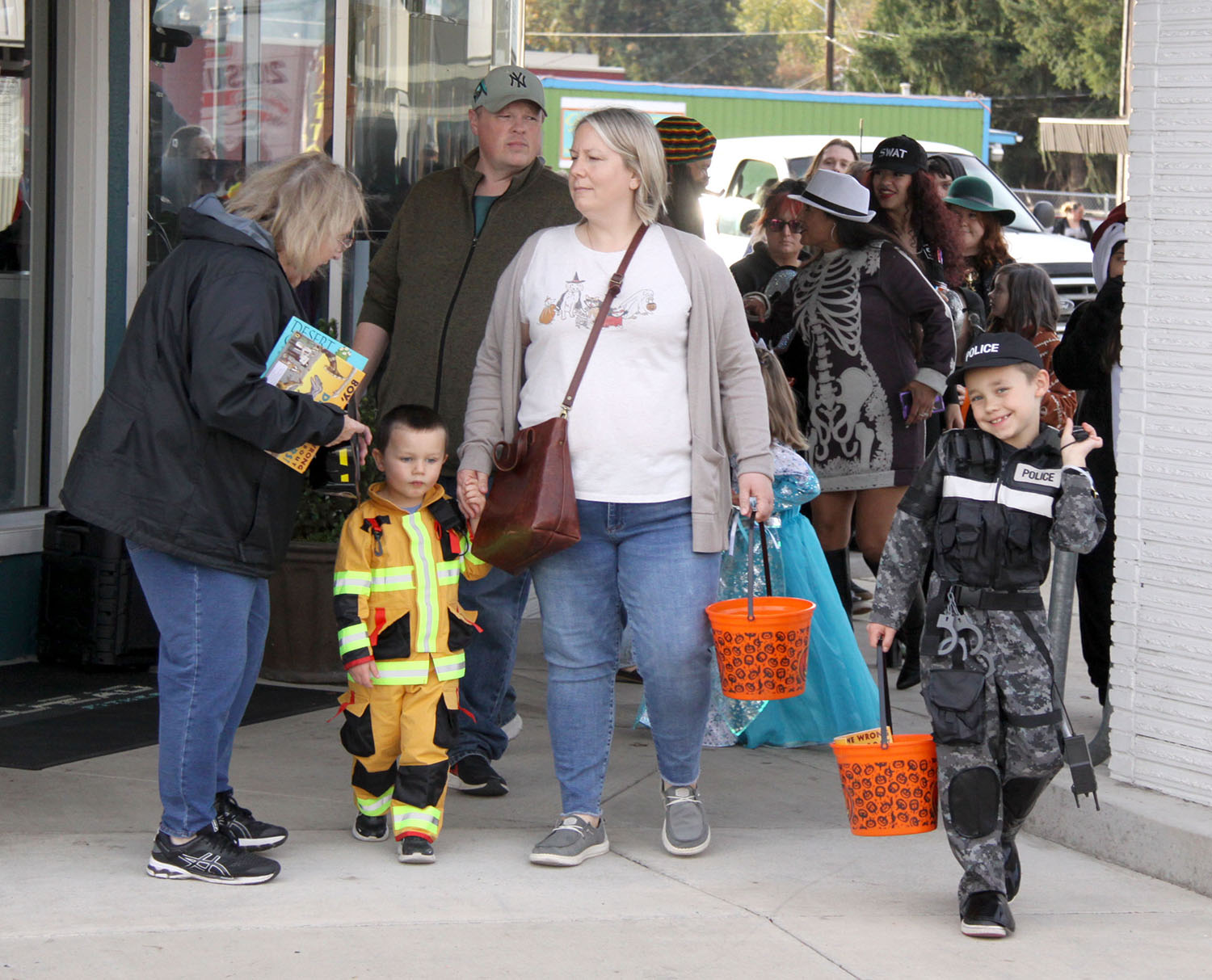 Paula Newman, left, owner of Figaro’s Pizza, hands out candy as a long line of trick or treaters await the goodies on Main Street. Photos by Scott Swanson