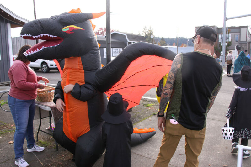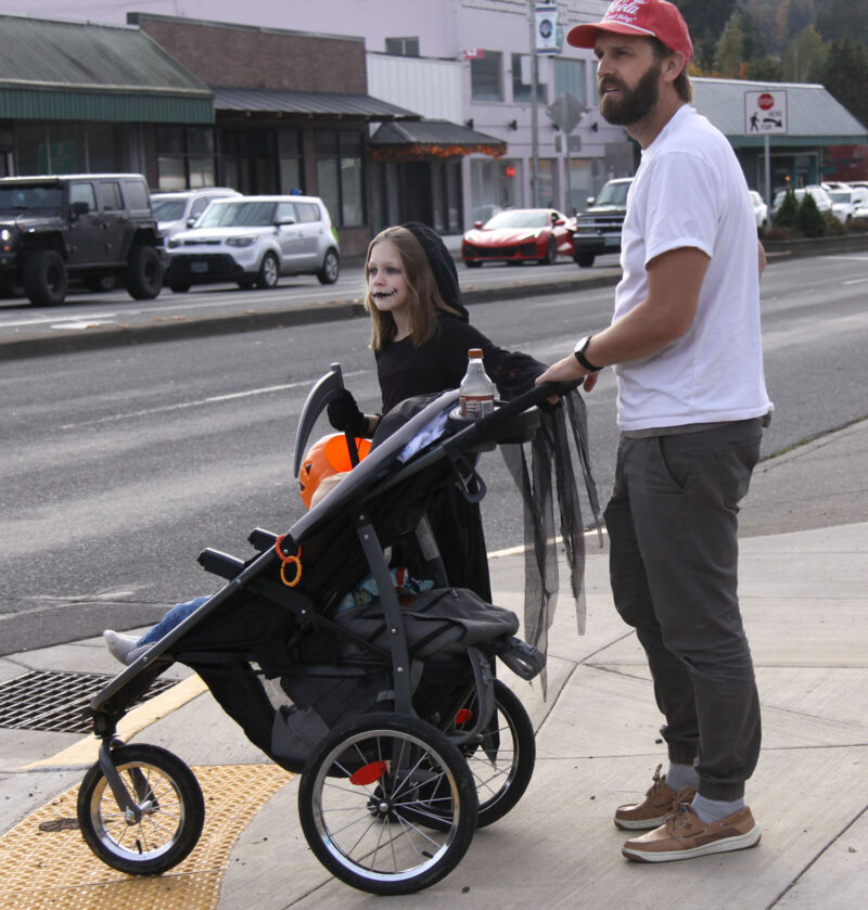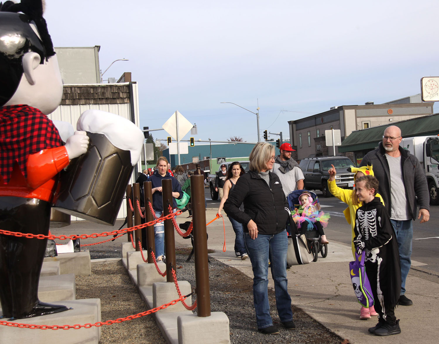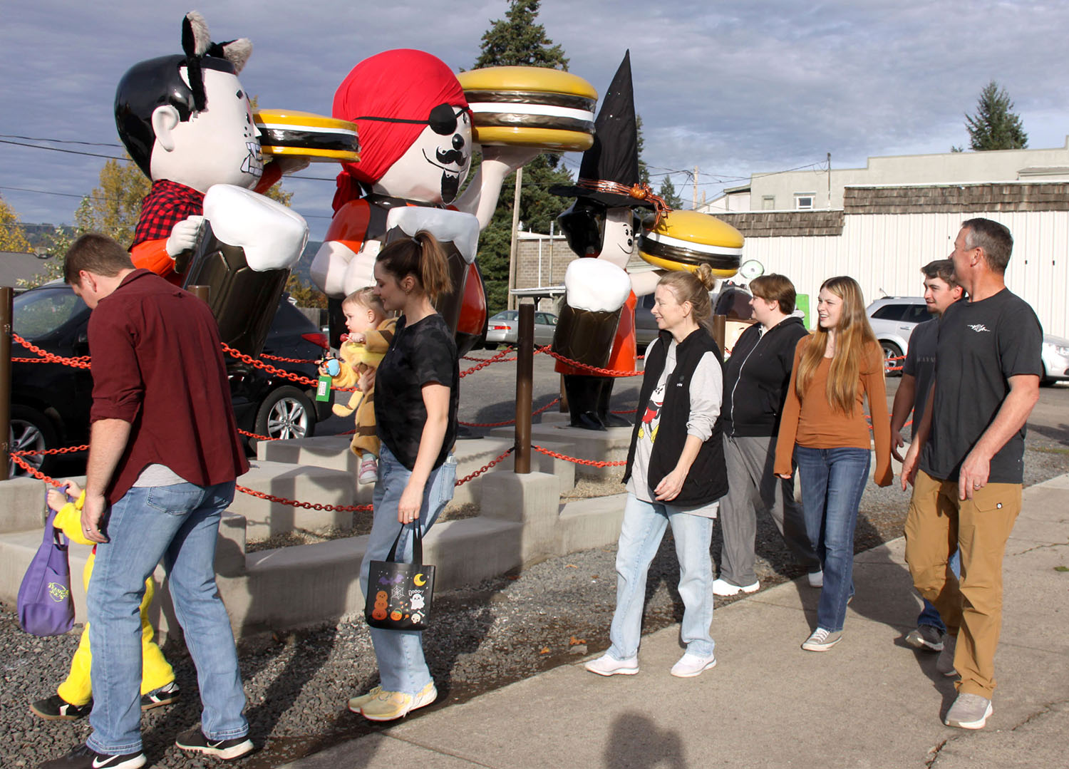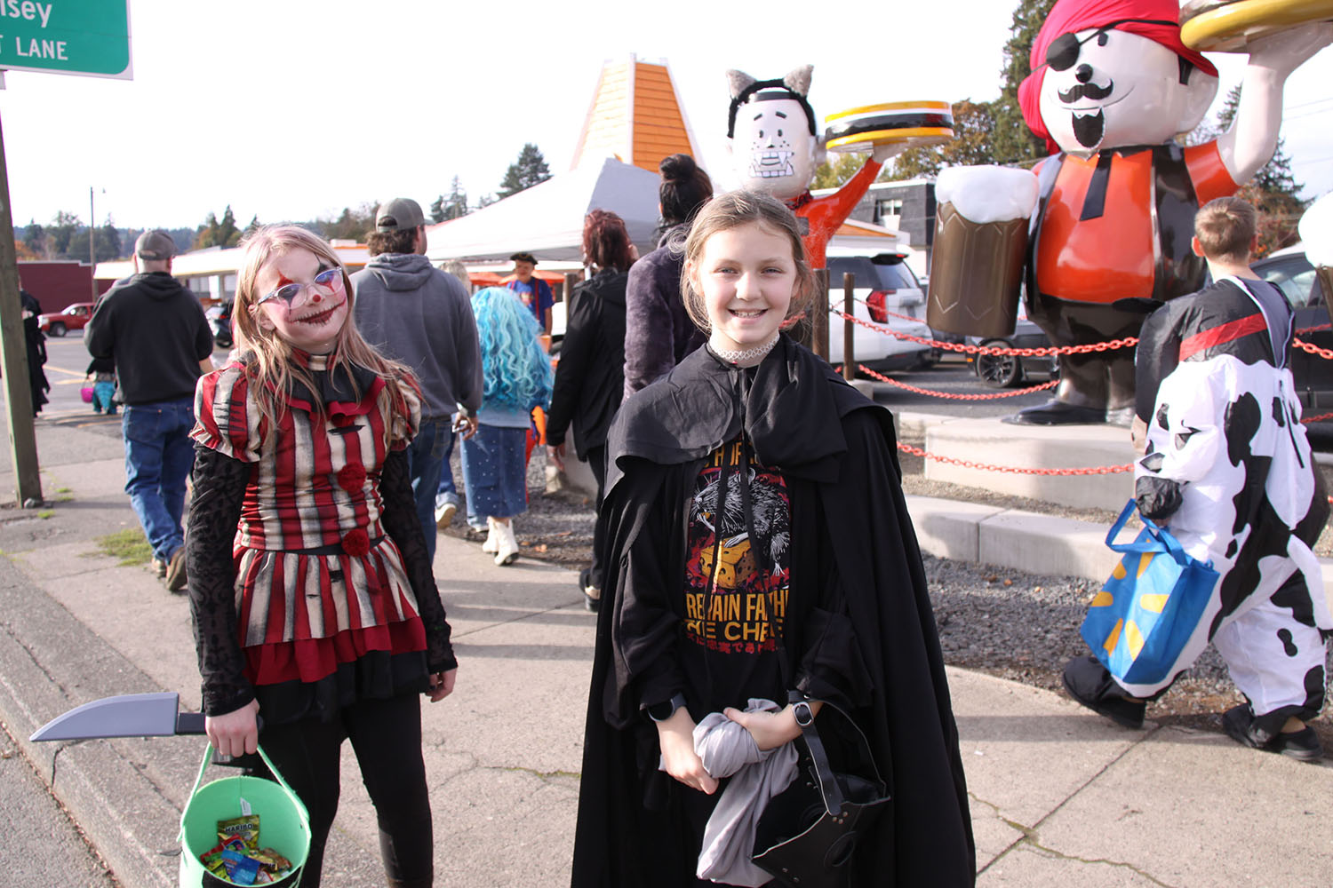 Paula Newman, left, owner of Figaro’s Pizza, hands out candy as a long line of trick or treaters await the goodies on Main Street. Photos by Scott Swanson