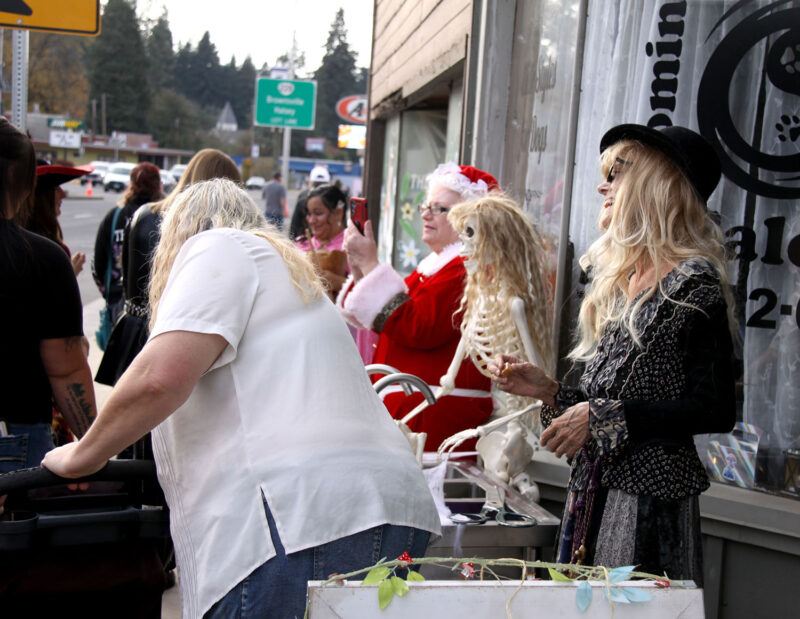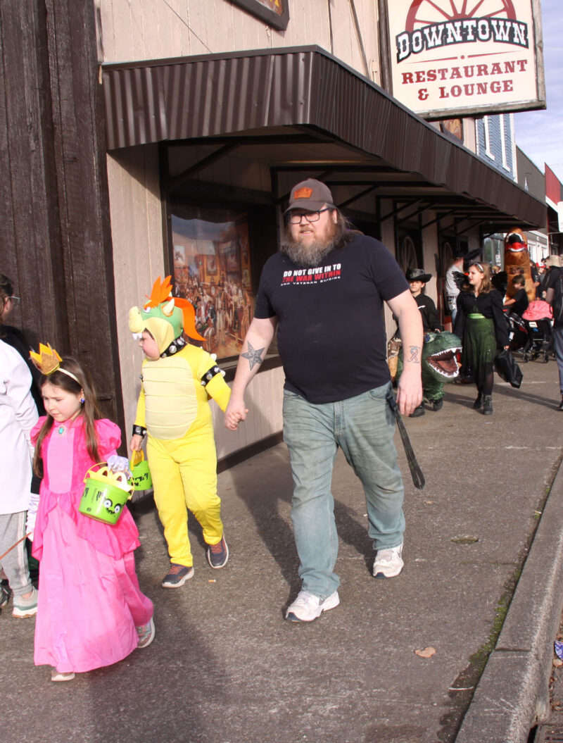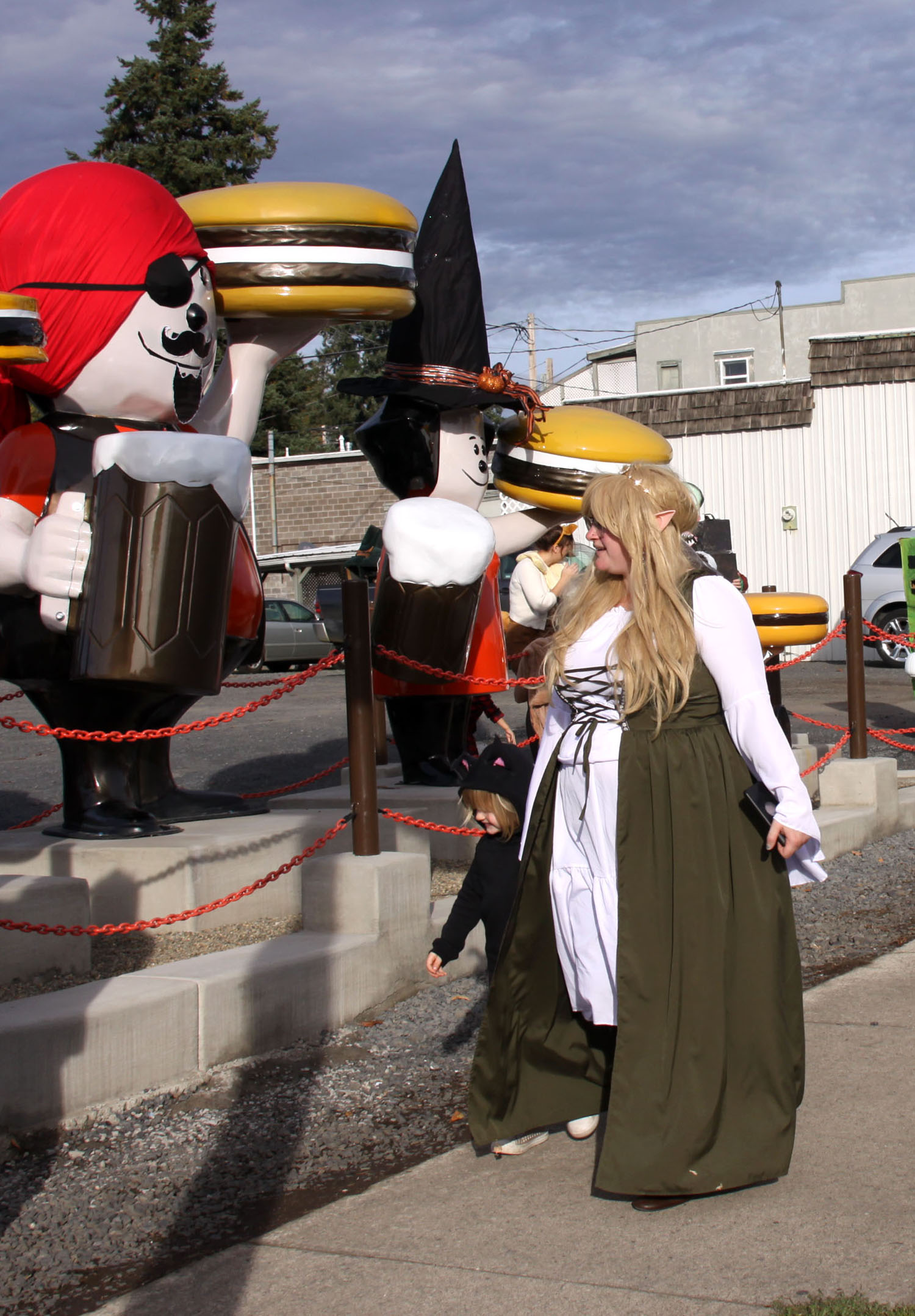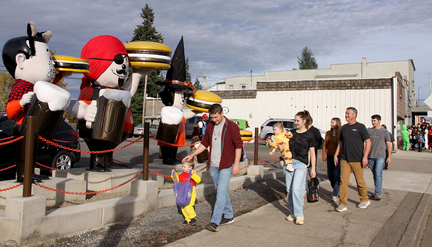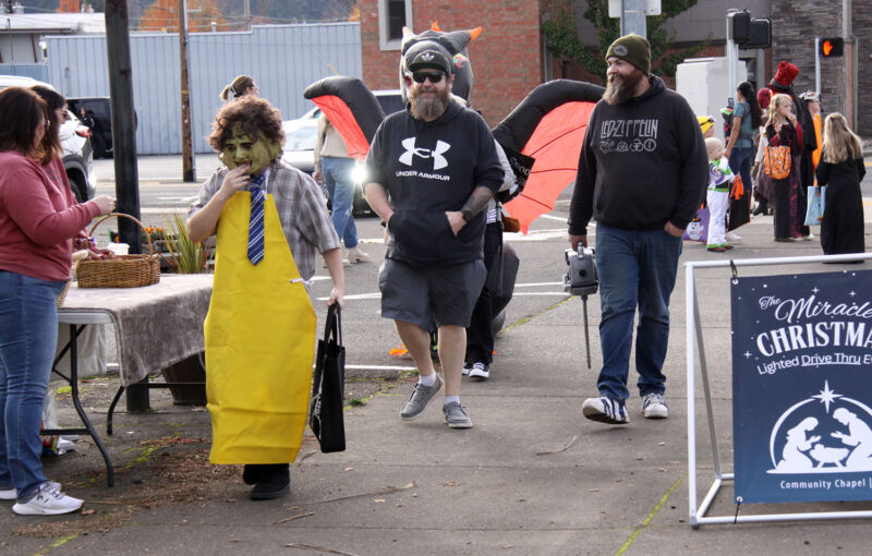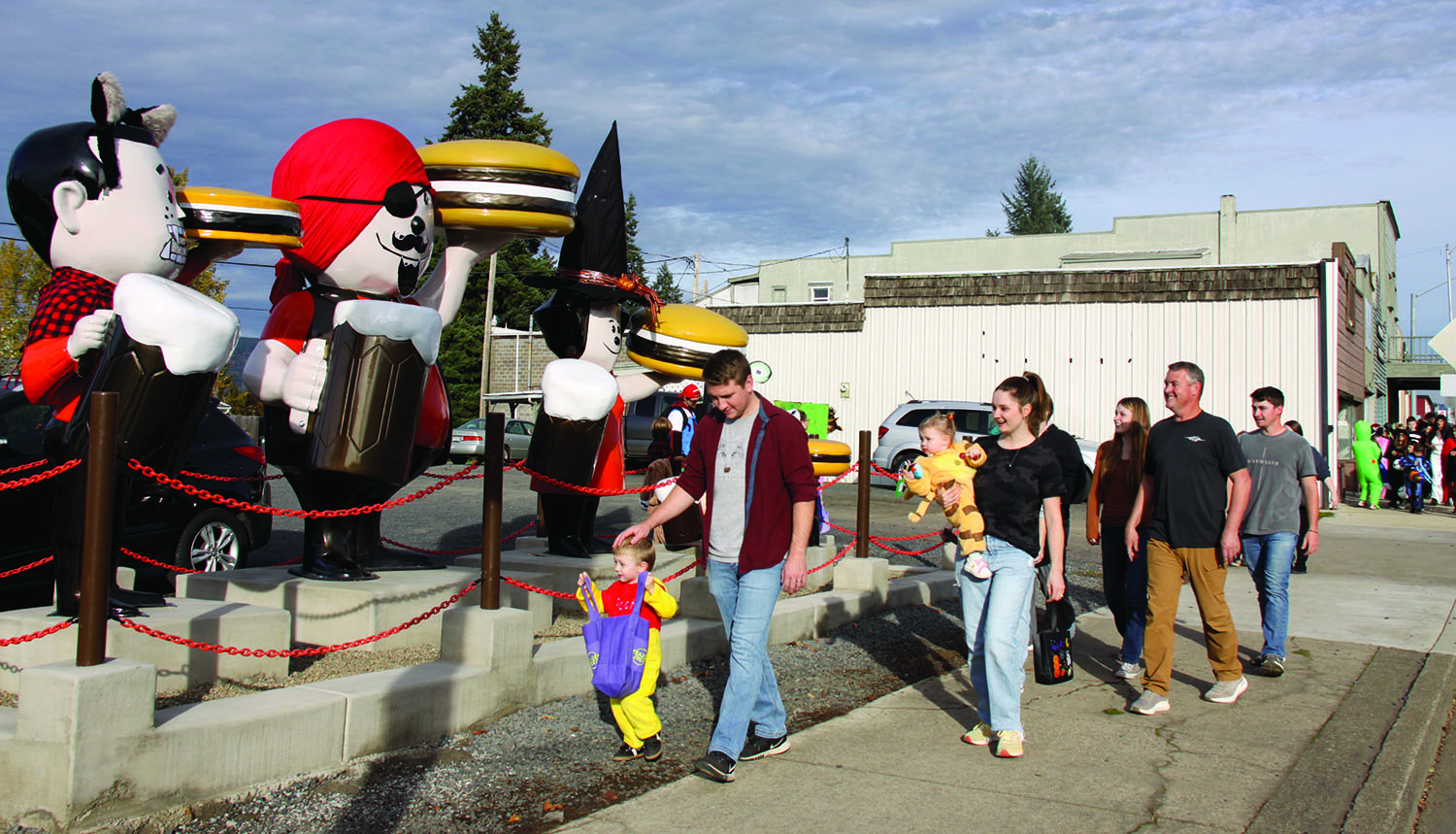 Paula Newman, left, owner of Figaro’s Pizza, hands out candy as a long line of trick or treaters await the goodies on Main Street. Photos by Scott Swanson